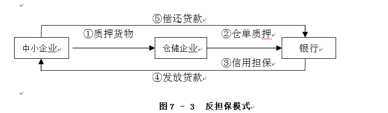 對(duì)于某些以寄存在倉(cāng)儲(chǔ)企業(yè)倉(cāng)庫(kù)中的貨物向銀行申請(qǐng)倉(cāng)單融資仍有困難的中小企業(yè),可以通過(guò)反擔(dān)保模式得到貸款。該模式需要大型倉(cāng)儲(chǔ)企業(yè)構(gòu)建中小企業(yè)信用擔(dān)保體系,倉(cāng)儲(chǔ)企業(yè)以中小企業(yè)寄存的貨物作為反擔(dān)保抵押物,通過(guò)擔(dān)保實(shí)現(xiàn)貸款;或者倉(cāng)儲(chǔ)企業(yè)直接為中小企業(yè)申請(qǐng)倉(cāng)單質(zhì)押貸款提供擔(dān)保,間接地提供中小企業(yè)信用。具體操作流程如圖7-3所示。