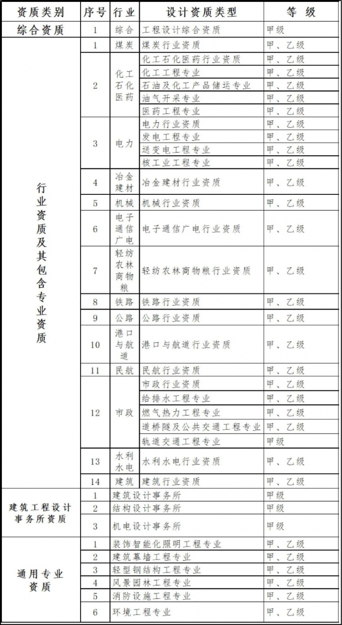 保留綜合資質(zhì)。對部分行業(yè)資質(zhì)進(jìn)行整合,其中,冶金行業(yè)與建材行業(yè)合并為冶金建材行業(yè)資質(zhì),輕紡行業(yè)、農(nóng)林行業(yè)、商物糧行業(yè)合并為輕紡農(nóng)林商物糧行業(yè),電子行業(yè)、通信行業(yè)、廣電行業(yè)合并為電子通信廣電行業(yè),石油天然氣行業(yè)并入化工石化醫(yī)藥行業(yè),軍工行業(yè)并入機(jī)械行業(yè),核工業(yè)行業(yè)并入電力行業(yè),資質(zhì)等級壓減為甲、乙兩級,原丙級資質(zhì)并入相應(yīng)行業(yè)乙級資質(zhì)。取消海洋行業(yè)及專業(yè)資質(zhì),相關(guān)企業(yè)可以換發(fā)相近行業(yè)資質(zhì)。整合原化工石化醫(yī)藥、石油天然氣、電力、市政行業(yè)中的專業(yè)資質(zhì),資質(zhì)等級壓減為甲、乙兩級,原丙級資質(zhì)并入相應(yīng)專業(yè)乙級資質(zhì);取消其他行業(yè)的專業(yè)資質(zhì),并入相應(yīng)行業(yè)資質(zhì),原甲、乙級專業(yè)資質(zhì)并入相應(yīng)等級的行業(yè)資質(zhì),原丙級專業(yè)資質(zhì)并入乙級行業(yè)資質(zhì)。將專項(xiàng)資質(zhì)調(diào)整為通用專業(yè)資質(zhì),取消環(huán)境工程專項(xiàng)資質(zhì)的5個(gè)專項(xiàng)類別,整合為環(huán)境工程專業(yè)資質(zhì),資質(zhì)等級壓減為甲、乙兩級,原丙級資質(zhì)并入相應(yīng)專業(yè)乙級資質(zhì)。保留3類事務(wù)所資質(zhì)。新3.jpg