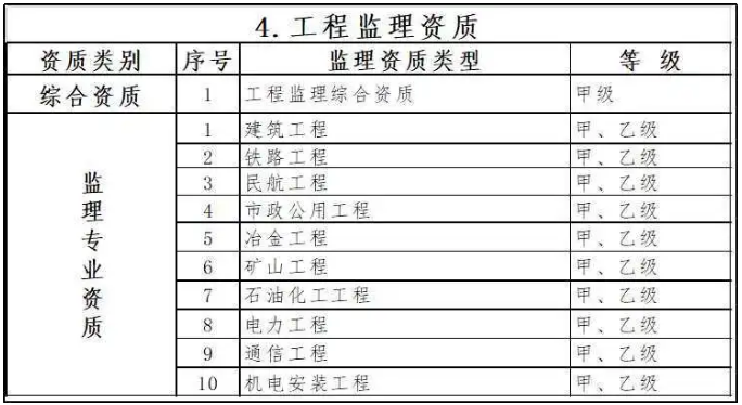 保留綜合資質(zhì)。取消水利水電工程、公路工程、港口與航道工程等專業(yè)資質(zhì),其資質(zhì)要求執(zhí)行有關(guān)行業(yè)主管部門規(guī)定。取消農(nóng)林工程監(jiān)理資質(zhì),建設(shè)單位委托農(nóng)林工程監(jiān)理業(yè)務(wù)時(shí),不再作資質(zhì)要求。上述4個(gè)監(jiān)理專業(yè)資質(zhì)取消后,相關(guān)企業(yè)可以換發(fā)相近專業(yè)同等級監(jiān)理專業(yè)資質(zhì)。監(jiān)理專業(yè)資質(zhì)等級壓減為甲、乙兩級,原丙級資質(zhì)并入相應(yīng)專業(yè)的乙級資質(zhì)。取消事務(wù)所資質(zhì)。