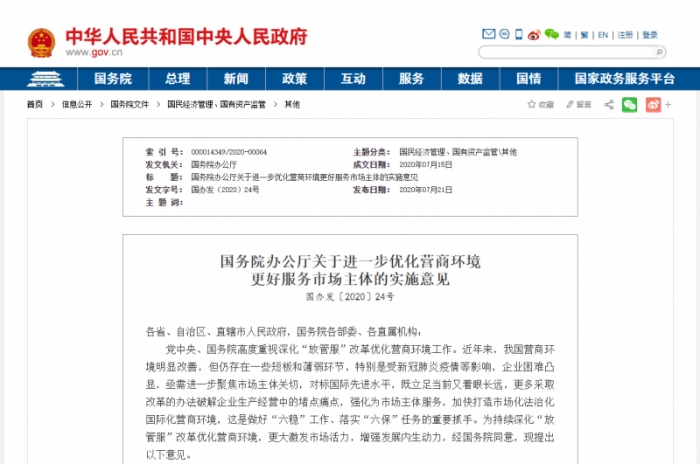 7月21日,國務院辦公廳下發(fā)《關(guān)于進一步優(yōu)化營商環(huán)境更好服務市場主體的實施意見》,要求,采取改革的辦法破解企業(yè)生產(chǎn)經(jīng)營中的堵點痛點,強化為市場主體服務,加快打造市場化法治化國際化營商環(huán)境。從6個方面,提出了20項任務。其中,1項由住建部牽頭落實,6項住建部分工負責。明確,2020年底前將工程建設(shè)項目審批涉及的行政許可、備案、評估評審、中介服務、市政公用服務等納入線上平臺,公開辦理標準和費用。