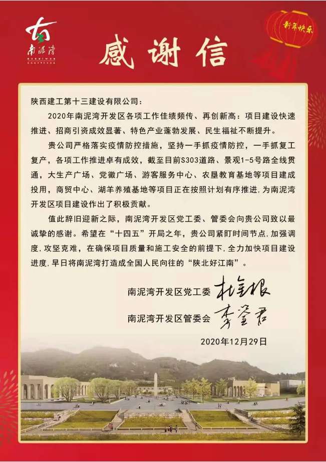 感謝信中提到,2020年陜建十三建公司嚴(yán)格落實(shí)疫情防控措施,堅(jiān)持一手抓疫情防控,一手抓復(fù)工復(fù)產(chǎn),各項(xiàng)工作推進(jìn)卓有成效,截止目前S303道路、景觀1-5號(hào)路全線(xiàn)貫通,大生產(chǎn)廣場(chǎng)、黨徽廣場(chǎng)、游客服務(wù)中心、農(nóng)墾教育基地等項(xiàng)目建成投用,商貿(mào)中心、湖羊養(yǎng)殖基地等項(xiàng)目正在按照計(jì)劃有序推進(jìn),為南泥灣開(kāi)發(fā)區(qū)項(xiàng)目建設(shè)作出了積極貢獻(xiàn)。