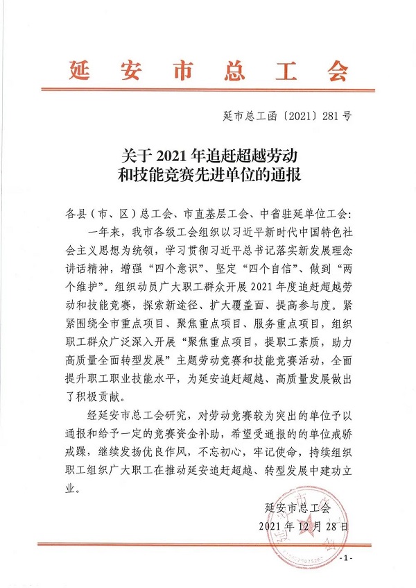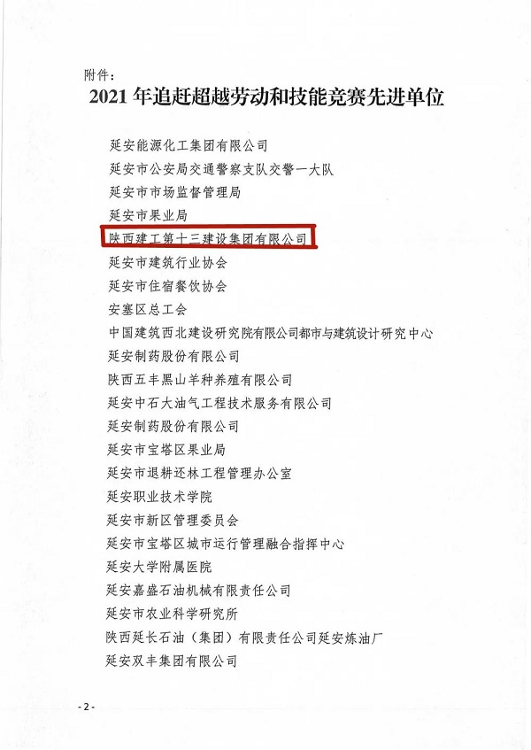 近日,延安市總工會公布了2021年追趕超越勞動和技能競賽先進(jìn)單位名單。陜建十三建集團榮獲延安市2021年追趕超越勞動和技能競賽先進(jìn)單位。