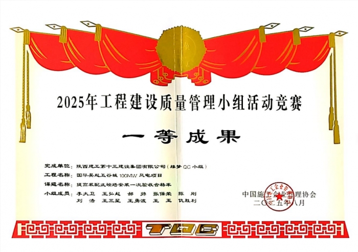 近日,中國施工企業(yè)管理協(xié)會公布了“2025年工程建設(shè)質(zhì)量管理小組成果大賽”獲獎名單,集團國華吳起五谷城100MW風(fēng)電項目“緣夢QC小組”參賽成果《提高裝配式砼塔安裝一次驗收合格率》獲得大賽一等獎。